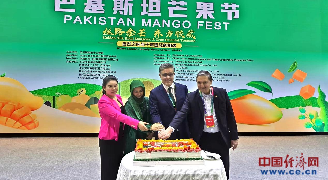 巴基斯坦驻华大使卡里尔·哈什米(右二)与巴基斯坦参议院财经委员会主席萨利姆·曼德维瓦拉(右一)共同启动“巴基斯坦芒果节”活动。巴基斯坦驻华大使馆供图