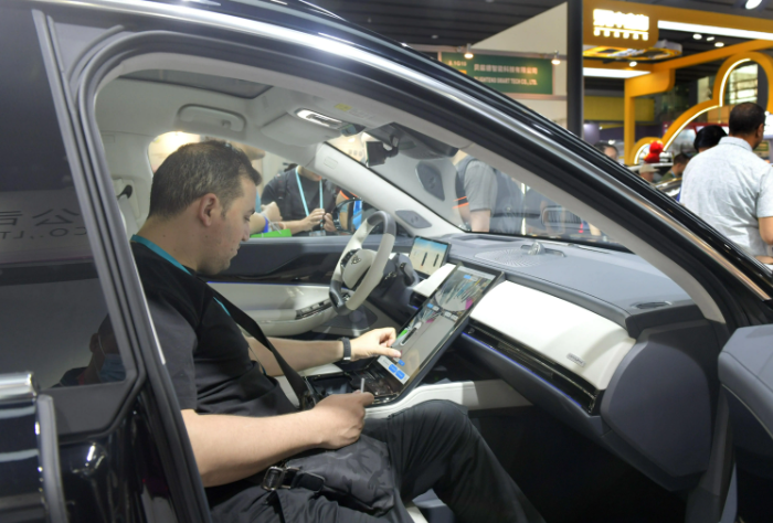 资料图片:2024年4月15日采购商在广交会上参观体验一款新能源车。 新华社记者 卢汉欣 摄