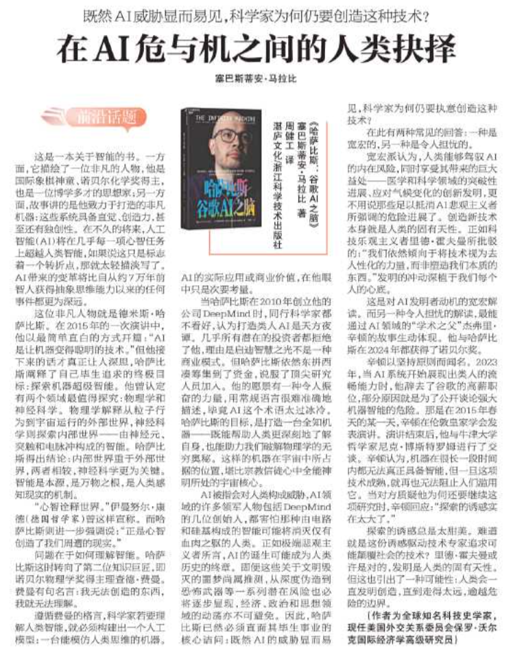 AI被指会对人类构成威胁,AI领域的许多领军人物包括DeepMind的几位创始人,都害怕那种由电路和硅基构成的智能可能将消灭仅有血肉之躯的人类。正如极端悲观主义者所言,AI的诞生可能成为人类历史的终章。即便这些关于文明毁灭的噩梦尚属推测,从深度伪造到恐怖武器等一系列潜在风险也必将逐步显现,经济、政治和思想领域的动荡亦不可避免。因此,哈萨比斯已然必须直面其毕生事业的核心诘问:既然AI的威胁显而易见,科学家为何仍要执意创造这种技术?